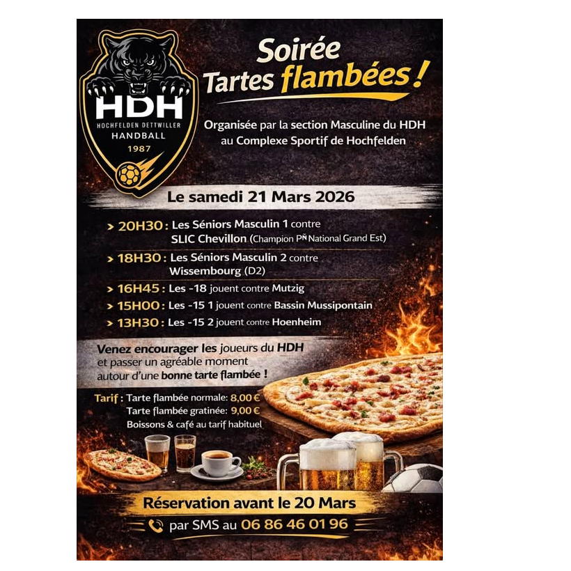 LE HDH vous invite à sa soirée tartes flambées au complexe lors des matchs du samedi 21/03