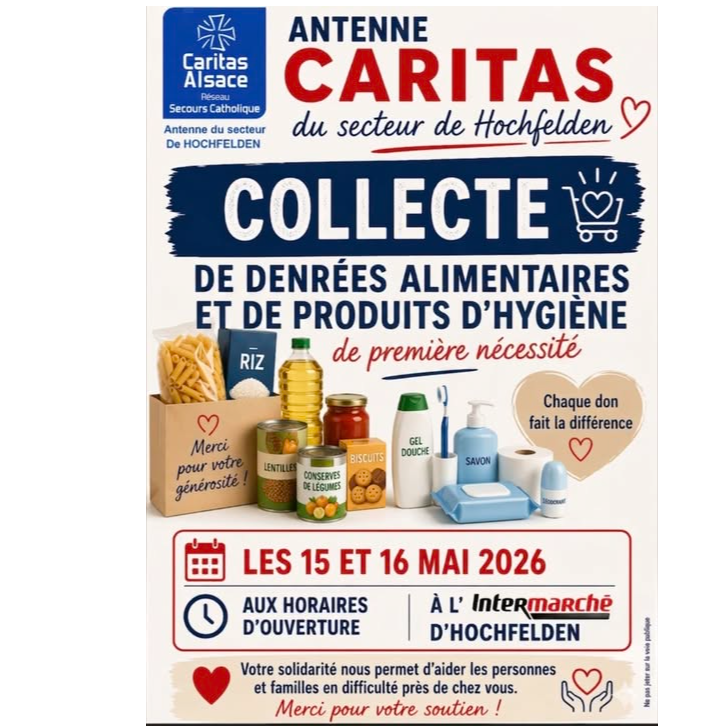 L'antenne Caritas organise une collecte de denrées aimentaire et de produits d'hygiène les 15 et 16 mai à Intermarché