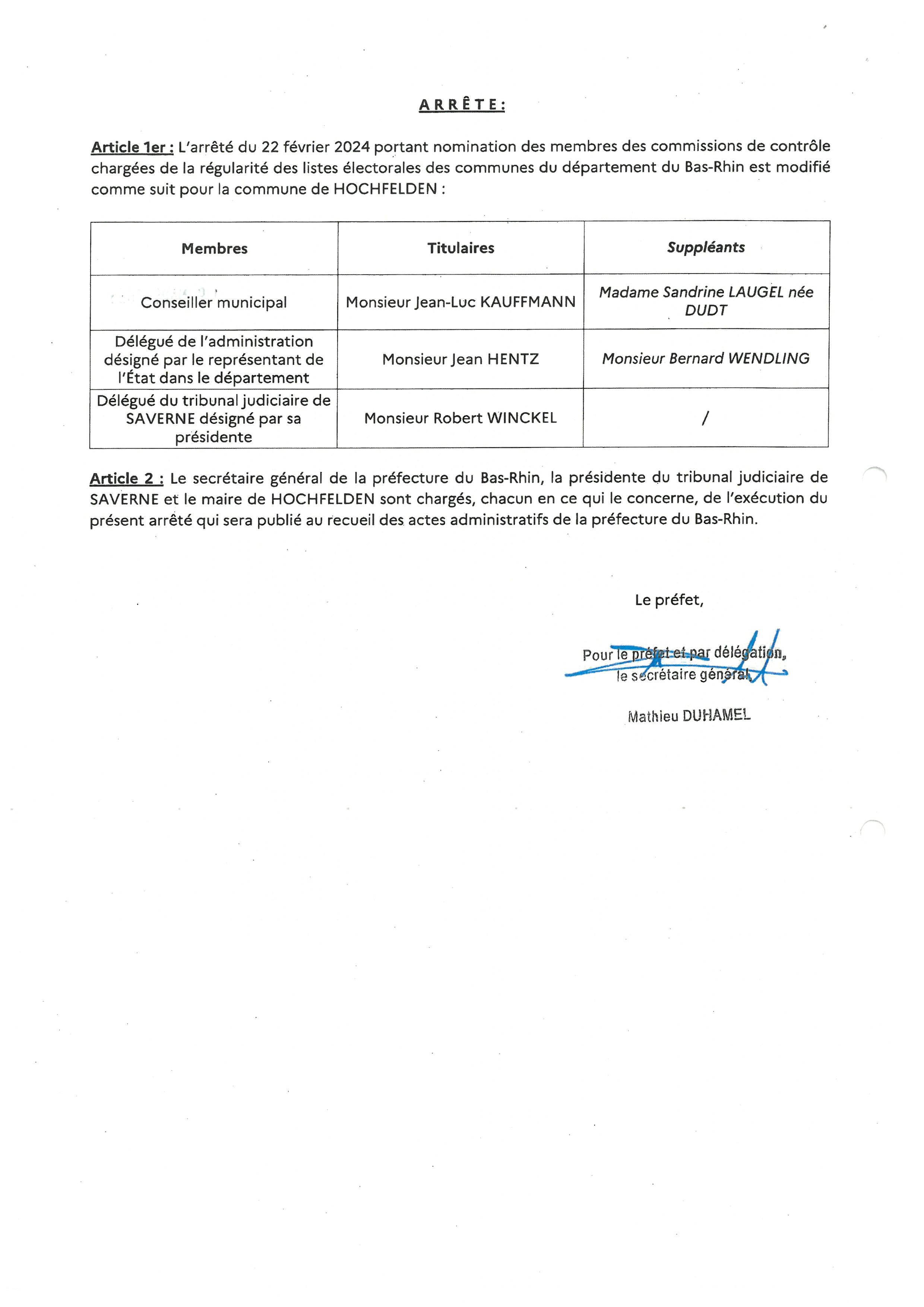 modifiant la composition de la commission de contrôle chargée de la régularité des listes électorales de la commune de Hochfelden du 19 MARS 2025